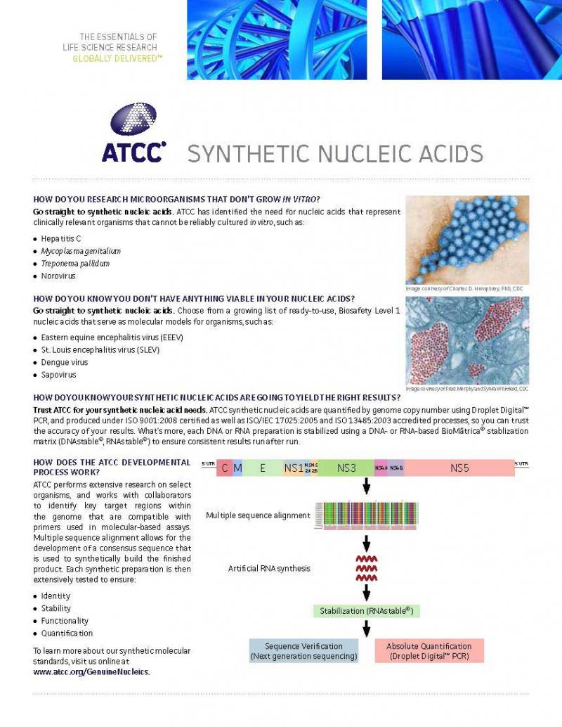 ATCC提供包括丙型肝炎、生殖支原体、梅毒螺旋体、诺瓦克病毒等临床上常见微生物直接合成的基因组。这些基因组通过Droplet Digital™ PCR确定拷贝数。生产过程符合ISO 9001:2008 ISO/IEC 17025:2005和ISO 13485:2003认证。基因组中已加入DNA或RNA稳定剂 (DNAstable®或 RNAstable®)以确保后续实验的一致性。