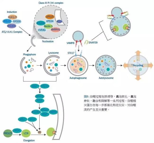 自噬过程包括诱导,囊泡核化,囊泡伸长,融合和降解等一系列过程。自噬相关蛋白在每一步都催化特定反应,对自噬流的产生至关重要