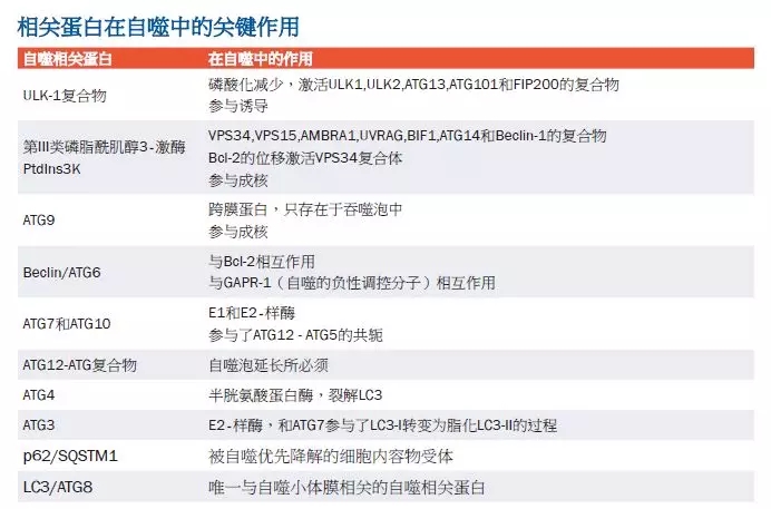 在酵母中,自噬过程共有31种自噬相关蛋白(ATG)的参与调节,许多自噬相关蛋白在哺乳动物中都是保守的。每个自噬相关蛋白都在自噬的动态过程中发挥着特定的作用。