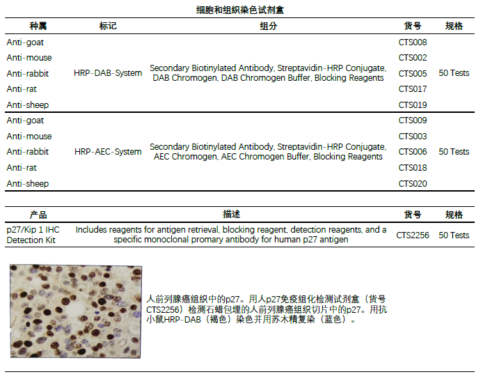 细胞和组织染色试剂盒用于各种组织学和细胞学样品中抗原的定位。这些试剂盒是基于亲和素与结合了组织里目标抗原的一抗之间形成的亲和素-生物素复合物(ABC)的原理,设计成即用型的规格。包含了稀释好的生物素标记的二抗和 HSS-HRP,无须额外的孵育步骤,减少了手工操作的时间,降低了人为估算错误的风险,非常方便。