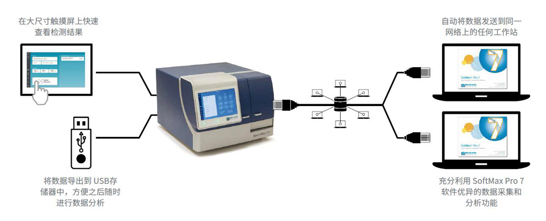 读板机正面嵌入大尺寸、高分辨率的触摸屏,您可以通过交互式界面调用内置的 SoftMax 触屏软件程序,方便调用预制模板进行检测或根据需求修改模板进行相应实验,无需外置专用的电脑。