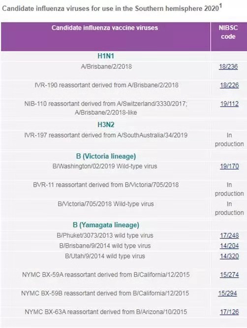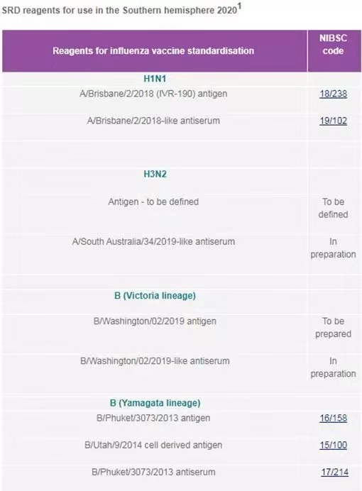 近日NIBSC刚刚更新了南半球2020年候选流感病毒和相关抗原抗血清标准品: