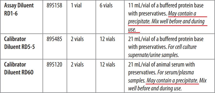 这些成分在低温或是稀释液微量蒸发的情况下,会出现结晶或浑浊的现象,如下图所示的那样,会在说明书中详细标注。(图例:Human sTNF RII/TNFRSF1B Quantikine ELISA Kit,货号 DRT200)。