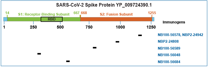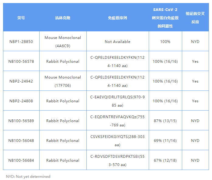 SARS-CoV-2 的表面糖蛋白或刺突蛋白与 SARS-CoV 的刺突蛋白具有 76% 的序列同源性。Novus Biologicals® 提供了几种用于检测 SARS-CoV 刺突蛋白的抗体,这些抗体可用于 WB、ICC / IF、ELISA 等多种应用。根据Novus 的创新计划,不妨试验其中的抗体用于检测 SARS-CoV-2。