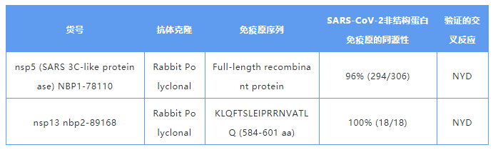 SARS-CoV-2 与 SARS-CoV 的 nsp5 具有 96% 序列同源性,nsp13 具有 99% 的序列同一性。Novus Biologicals® 提供了针对 nsp5(NBP1-78110)和 nsp13(nbp2-89168)蛋白的兔多克隆抗体,这些抗体可用于 WB、ICC / IF、ELISA 等多种应用。