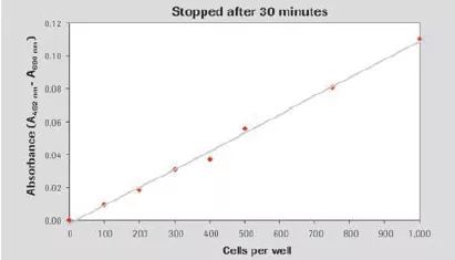 图1. Cytotoxicity Detection KitPLUS (LDH)具有良好的线性;图为使用该试剂盒测定不同数目U-937细胞培养基中总LDH活性,底物孵育5min后进行检测。