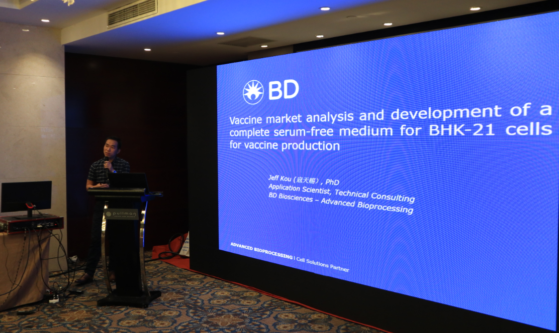 BD公司高级生物工艺部门高级工程师寇天赐对“疫苗市场分析及BHK无血清培养基开发”进行了主题演讲