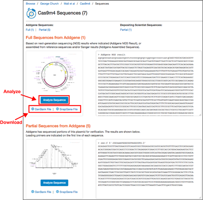 On this page you can download an annotated Genbank File or a SnapGene file for the sequences listed. You can then analyze the sequence in your sequence viewer of choice. If the depositor provided a custom annotated GenBank file, this can be found on the main plasmid page under the "Resource Information" section