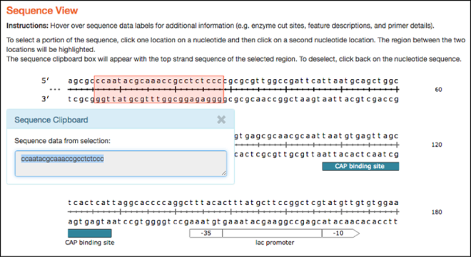 Similar to the plasmid maps, the linear sequences hosted here are now interactive and have similar hover over features. As with the map tab, clicking on two separate locations in the linear sequence selects the sequence between the two locations and sends it to the clipboard for copy and paste functionality.