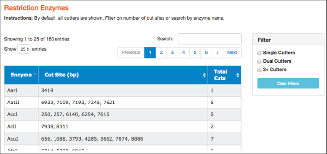 Here you'll find a table of restriction enzymes that cut the given sequence. The table includes enzyme names, the locations where the enzymes will cut (in basepairs), and the total number of times they cut. Use the filters on the right to find single, dual, and 3+ cutters. You can also sort enzymes by clicking on column heads. Clicking on a particular restriction enzyme here also highlights it in the “Map” and “Sequence” tabs.