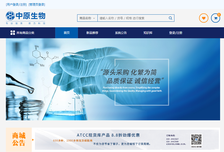 中原公司一直以“推动生命科学事业,服务于全人类健康”为使命!为客户打造优质高效,安全可靠的生命科学产品公共服务平台。面对日新月异的全球生物产业热点需求,中原公司不断提高服务水平,充分发挥自身优势,服务理念从“传统模式”向“互联网+模式”升级。中原公司网上商城于2019年5月1日正式上线,商城地址:  http://shop.sinozhongyuan.com/